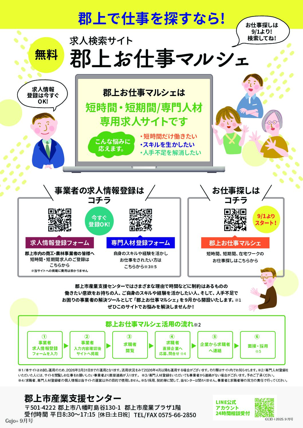お仕事マルシェチラシ(広報用) 【郡上お仕事マルシェ】9月1日より運用開始 「短時間・短期間だけ働きたい」「空いた時間を活かしたい」「自分のスキルや経験を活かしたい」そんな声に応える、新しい求人検索サイトがまもなく始まります。 子育て中の方、まだまだ元気なシニア世代、長期休暇の学生...